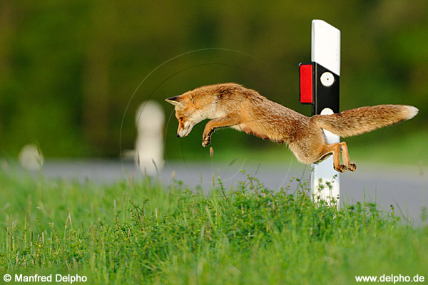 Fuchsfähe bei der Mäusejagd am Straßenrand · Nordhessen