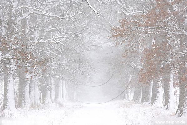 Eichenallee im Schneesturm · Reinhardswald, Nordhessen