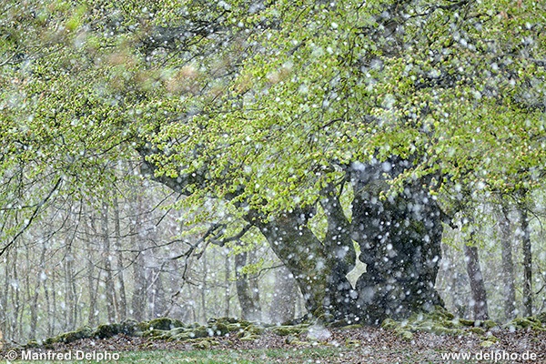 Schneetreiben im Frühlingswald, Hutewald Halloh, Naturpark Kellerwald-Edersee, Nordhessen
