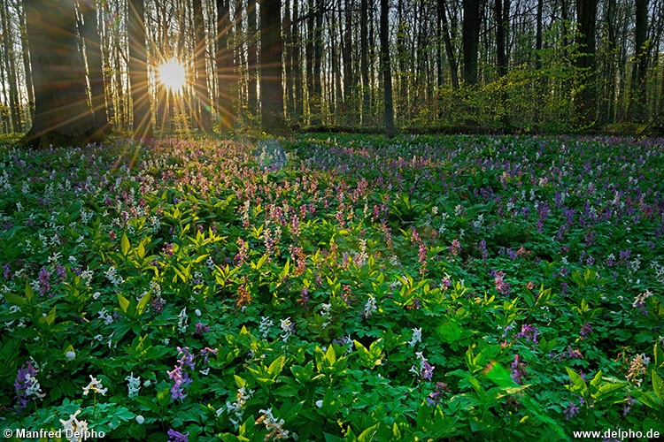 Lerchensporn bei Sonnenaufgang, Nationalpark Hainich, Thüringen