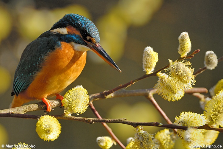 Eisvogel in Salweidenblüten, Ems, Nordhessen
