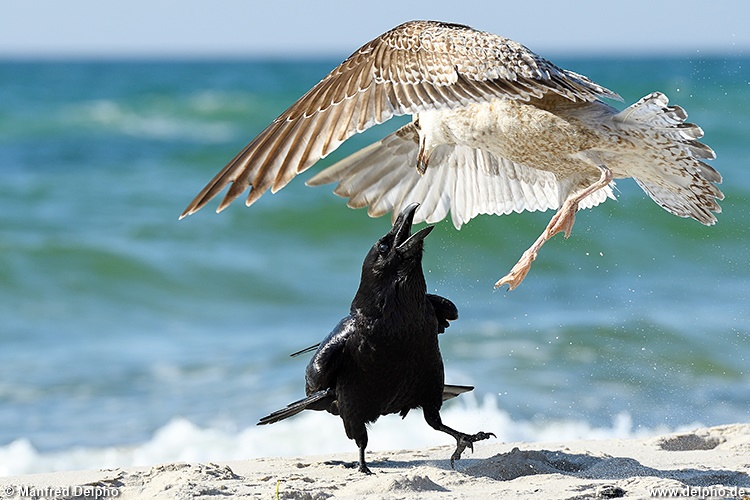 Kolkrabe und junge Silbermöwe, Darßer Weststrand, Fischland-Darß-Zingst, Mecklenburg-Vorpommern