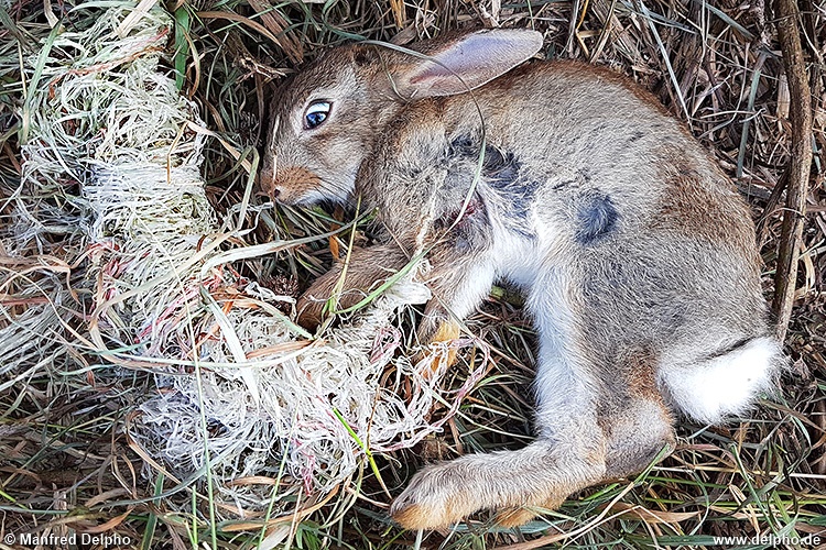 Junger Feldhase in Plastikschnüren von alten Strohrundballen verheddert. Der noch lebende Feldhase wurde befreit und hoppelte nach kurzer Ruhepause davon. Ederbereich bei Wabern, Nordhessen