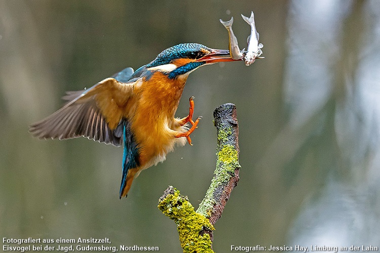 Fotografiert aus einem Ansitzzelt, Eisvogel bei der Jagd, Gudensberg, Nordhessen, Fotografin: Jessica Hay, Limburg an der Lahn