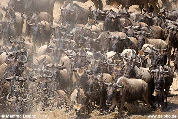 Gnus crossing Mara River · Masai Mara, Kenia